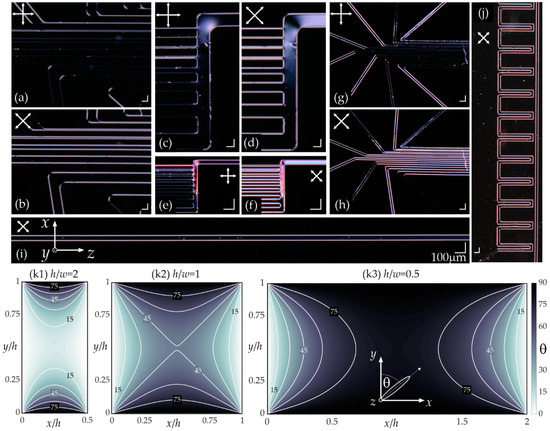 (a–h) The PDMS:glass-based sets of test microchannels of different widths infiltrated with 5CB NLC and observed under the polarizing microscope. Details related to channel dimensions are given in the text. (i,j) POM images of the 50-µm-wide channels of different geometries obtained in the PDMS:PDMS architecture using the SU-8 mold. The scale bars are 100 µm in all of the photographs. (k1–k3) Results of the numerical simulations showing the LC molecular arrangement (determined by the orientation angle θ in the x–y plane) in the microchannels’ cross-sections with different aspect ratios (h/w).