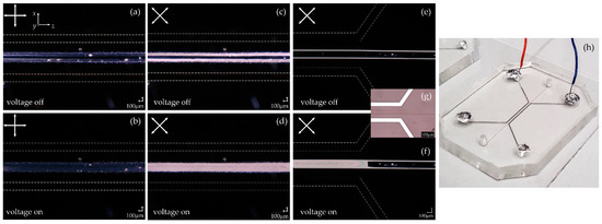 Eventually, studies on the efficient reorientation of the liquid crystal molecules under the influence of an external electric field were performed. For this purpose, the micropattern with three channels (see Figure 7h)—the central one (to be filled with LC) and two side channels (to be injected with metal eutectic Ga-In)—was replicated in PDMS using two molds made of the Chromaline Super PHAT 200 photostencil film and SU-8 photoresist, respectively. The width of each channel was designed to be 200 µm, as was the distance between them. In the case of the first technology, the manufacture of the mold is not so precise, and the main channel was again wider than anticipated. Depending on the mold used for fabrication, the height of the microchannels was about 200 µm and 30 µm, respectively. Both structures were made by bonding the PDMS layer to the glass substrate. The side channels (with the length of 10 mm for the section parallel to the main channel with the liquid crystalline material) were infiltrated with the eutectic gallium–indium using a syringe with a specially prepared needle. A sinusoidal alternating voltage (at the frequency of 1 kHz) was applied to the microstructured electrodes. At the peak-to-peak voltages of 300 V and 150 V, the complete reorientation of the E7 and 5CB NLC molecules (with their long axes aligned with the direction of the electric field) was observed in the first (UV-cured photostencil film) and the second (SU-8) structure, respectively. The electrically-driven change in a molecular arrangement is shown in the POM images given in Figure 7a–f. This effect is particularly evident in the case shown in Figure 7f, where an initial part of the structure is presented with the electrode feeder channel just approaching the main channel. Two regions of entirely different molecular orientation (i.e., homeotropic and planar) were achieved. The disagreements in the voltages applied in both cases (i.e., for structures fabricated using different molds) may be related to the geometrical differences (the different dimensions and aspect ratios of the channels) and unidentical physical properties of the liquid crystal materials (e.g., different elastic constants and electric permittivities). However, only qualitative observations of the changes in the orientation of the liquid crystal molecules under the influence of an electric field were aimed for in this phase of the studies.