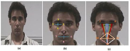 Computation of Geometric Features: (a) Original Image, (b) Ratios of length to width of eyes and lips, (c) Triangles and Angles.