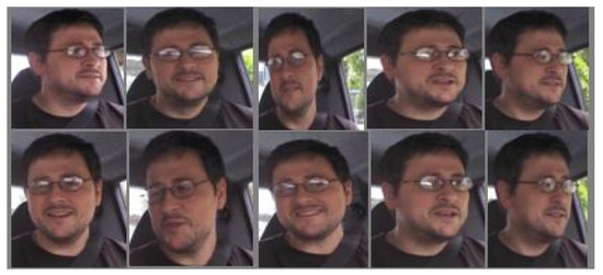 The DrivFace dataset contains images and a video repository of driving scenarios under an uncontrolled environment. The dataset contains 606 samples of 640 × 480 pixels. It is generated using four drivers (two women and two men). The dataset includes various facial features, such as glasses and beards. The normalized version of this dataset (80 × 80 pixels) is also available as a MatLab file (drivFac.mat). The gaze direction of this dataset includes right, frontal, and left. Figure 5 shows key images of this dataset with different gaze directions.