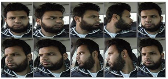This dataset, generated and used in our previous publication [78], consists of four videos containing frames with No Distraction (ND) or Distraction (D). The total frames for first, second, third, and fourth videos are 418, 409, 390, and 397, respectively, while the frames containing distraction (D) are 191, 221, 215, and 209. Figure 6 shows frames containing various types of Distraction (D) and No Distraction (ND). The driver’s head rotation of greater than 20 degrees is classified as Distraction (D) and vice versa.