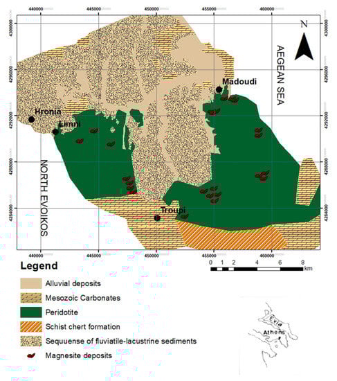 Magnesite tailings are located in central and northern Evoia and are occupied by Jurassic ophiolitic rocks such as harzburgites and basalts (Figure 1). These rocks overlay a mélange (the Pagondas complex), comprising Upper Triassic to Jurassic sedimentary and volcanic rocks, which was developed as an accretionary prism [20]. The entire sequence of the ophiolitic rocks and the mélange is thrust on the Pelagonian carbonate platform. The ultramafic rocks are covered by Pliocene terrigenous and minor marine and lacustrine sediments, and Quaternary deposits [21]. The overthrust of the Evoia ophiolite is structurally overlain by a dismembered metamorphic sole which constitutes evidence for a late Upper Jurassic emplacement age [22,23]. Magnesite is presented as cryptocrystalline, mostly nodular, and appears as open space fillings along joints of ultramafic rocks, forming stockworks, as veins controlled by brittle faults, indicating that magnesite was deposited during opening of the veins in an extensional geodynamic regime, and as nodular forms that resulted from replacement of ultramafic rock. Those nodules are mainly centimeter-sized and contain relics of chromite. Magnesite also predates deposition of dolomite and silica polymorphs where a vertical mineral zonation is evident: magnesite modal percentages decrease towards the surface, whereas dolomite and quartz gradually become more abundant. Moreover, vuggy silica textures are presented in the uppermost parts. Brecciation of early-formed magnesite and cementation by magnesite deposited at a later stage is also observed. Both the deposits of stockwork type of mineralization and the main veins have not been deformed. Significant displacements by younger faults affecting the deposits are not observed.