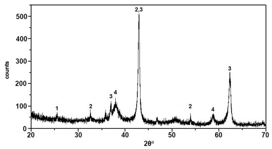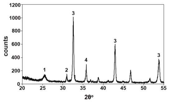 X-ray pattern of bulk mineral composition of final product. 1: Quartz, 2: magnesite, 3: periclase, 4: brucite.