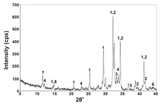 XRD pattern of P 52.5 Portland cement produced by Titan Co., Ltd. (Athens, Greece) where 1: C3S, 2: C2S, 3: C3A, 4: C4AF, 5: CaOf, 6:MgO, 7: CaSO4-2H2O-Gypsum, 8: CaSO4 0.5H2O-Bassanite.