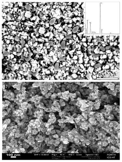 As it is shown in Figure 2a,b, fragments of serpentine are present in the microstructure of magnesite. Moreover, in Figure 2a, the replacement of magnesite by the coarse grain dolomite can also be observed. In general, the studied magnesite tailings presented are suitable to be used in a variety of applications in which an augmented content of nano MgO is needed.