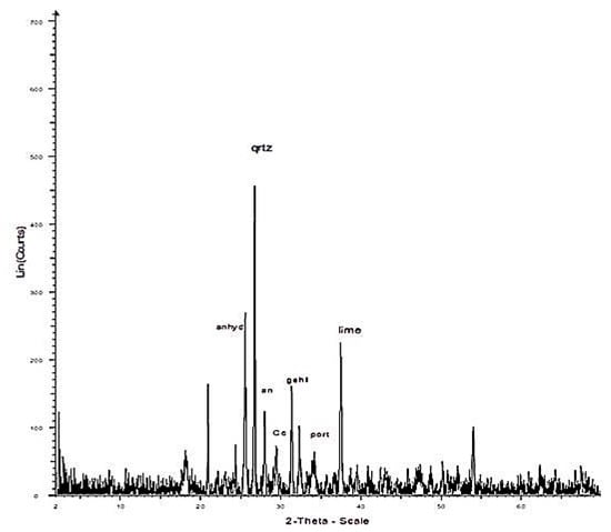 In this study, fly ash was also used, as numerous researchers have used fly ash as an additive for the production of cements of normal and of increased mechanical strength. For this reason, fly ash derived from a Kardia lignite-fired power plant in Ptolemais Basin was collected and studied in order to investigate the behavior and physicomechanical properties of the produced cement in combination with MEA. The characterization of the tested fly ash, which includes mineralogical composition, morphological determination, and chemical composition, revealed that fly ash is enriched in CaO (Table 4). The increased specific surface of its particles makes fly ash capable of restraining elements and participating in chemical reactions due to the microporous minerals included, such as clays and micas [26,27]. Furthermore, the SiO2 presence constitutes the main carrier of pozzolanic properties, making it useful in cement as an additive. The mineralogical analysis results are shown in Table 3, while powder X-ray diffraction patterns are shown in Figure 7. The basic components of Kardia fly ash are lime, anhydrite, calcite, gehlenite, and less quartz, plagioclase, and hematite. Micas appear in minor amounts. According to the XRPD results, in the fly ash, amorphous phase ranges to percentages of 25 wt%. Lime anhydrite and quartz appear as the major crystalline phases. Anorthite, portlandite, and gehlenite were also detected in lower amounts.
