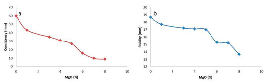 Influence of MgO on the (a) consistency and (b) fluidity of cement.