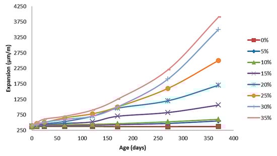 In the present study, the ability of cement paste to expand was examined, as it is a particularly important parameter of its basic characteristics. The present experimental study used numerous samples for a significant period of time up to 400 days, making a systematic study of the raw materials which showed that a specific content of nano MgO and fly ash in powder as specific additives can be decisively active in the controlled shrinkage and expansion of the cement. This achieves the desired degree of volume dimension, while compensating for the shrinkage effects, avoiding the volume shrinkage of the cement. The present raw materials, as they do not present metallic elements, are not feasible and will affect any future Fe reinforcements. Its dilating action seems to begin in the first 8 days and ends depending on the ratio of nano MgO/fly ash from 8 to 400 days. Samples containing low percentage of MgO immediately complete their expansion, while mixtures with an increased percentage in nano MgO continue to evolve 400 days later. The expansion of the cement paste has been remarkably improved due to the nano MgO addition; nevertheless, the accurate limits of the MgO content added have not yet been defined. The expansion performance increases as the nano MgO content increases, following the extension of the curing age. Firstly, the expansion of the cement paste containing nano MgO oxide was significantly higher than that of the cement paste without MgO oxide. This may have happened because the nano MgO particles were small, and Mg(OH)2 crystals were quickly formed due to hydration, and as a result, this gives higher expansion to the cement paste. Furthermore, Mg(OH)2 crystals grow around the pore rims and near the MgO particles, and the increased volume of Mg(OH)2 crystals squeezes the surrounding cement paste and causes expansion [6,30,35,36]. The expansion of the tested cement paste samples are presented in Figure 10. As can be observed from the diagram (Figure 10), as the nano MgO rises, the expansion increases. The expansion of the sample without nano MgO was 364 μm/m after autoclave curing, while the expansion amounts were 1060, 1700, 2500, 3300, and 4000 μm/m when nano MgO was 4, 5, 6, 7, and 8%, respectively, after autoclave treatment. Several scientists have obtained similar results [6,35]. It is worth mentioning that in the expansion test, a clear discrimination among the three groups is observed, characterized by clear limits in the used mixtures of nano MgO/fly ash. In the present systematic study of the effect of additives on the behavior of the produced cement, representative samples from the two groups were studied, giving the most satisfactory results in order to identify the effect of raw materials on the final behavior of cement.