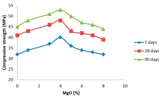 Moreover, the physical interpretation of the diagrams of Figure 9 and Figure 10 is harmonious with the final behavior and strength of the hardened cement directly dependent on the mineral raw materials, where they participate in the composition of the cement (Table 1). In general, the cement strength seems to show increasing trends in the tests of 7, 28, and 90 days for contents of nano MgO up to 4% of the volume of cement, probably because the microstructure improved after nano MgO incorporation. With the extension of the curing age, the compressive strength of all samples gradually increased, most likely because fly ash underwent a pozzolanic reaction, which improved the interface transition zone of the cement [37]. However, we can observe that when the content of MgO was up to 4%, the compressive strength values, regardless of the curation days, show reducing trends, which is probably due to the development of a strong network of microcracks in the structure of the mortar, displaying its properties. We found similar conclusions from the test of expansion. In addition, hydration of C–S–H in these critical samples seems to have been accelerated, leading to the loss of cohesive forces within the cement structure.