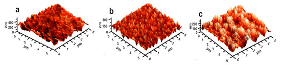 The AFM results of cement made by nano MgO and fly ash additives: (a), group I, (b) group II, (c) group III.