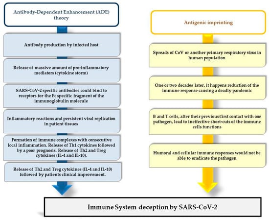 Alongside the complex ADE phenomenon, another interpretation which may account for a second more severe infection based on the same viral etiology of the first one is antigenic imprinting. This hypothesis proposes a reduced host immune response against a respiratory virus when such a pathogen comes into contact with the host for the first time early in life. The trend of human immune system B cells and T cells to overly trust on previous/first contact with any given pathogen, leads to ineffective short-cuts of immune cells functions which eventually would not be able to eradicate the pathogen [,].