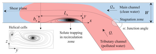 The junction angle influences near-field mixing by creating a recirculation zone and helical cells downstream of the confluence. Near-field mixing at confluences can be divided into rapid mixing, where transverse mixing is completed within a short distance, and slow mixing, where transverse mixing is maintained further downstream [30]. Lane et al. [31] found that the presence of channel-scale circulation at a confluence transforms slow mixing into rapid mixing. Rapid mixing occurs when a tributary flow flows into a main channel with a large junction angle. In such cases, a difference in concentration between the main and tributary channel creates a mixing interface in which the vertical gradient is increased, leading to the stimulation of vertical mixing and rapid completion of transverse mixing. In this context, Ramón et al. [14] stated that the momentum flux ratio and junction angle are important hydraulic factors that influence the location of the mixing interface. Furthermore, weak density contrast at the confluence increases the mixing area by distorting the mixing interface, leading to an increase in transverse mixing [32]. The effect of density contrast on mixing is more dominant farther downstream from the confluence than differences in the velocity of the main and tributary channel [33]. Lewis et al. [16] demonstrated that a tributary flow with strong momentum flux induces helical motion, which moves the mixing interface toward the outer bank, causing transverse mixing to increase. The strong momentum flux affects not only the helical motion but also the flow separation, which causes solute storage. Constantinescu et al. [26] demonstrated that strong Kelvin–Helmholtz instabilities induce vortex pairing in the mixing layer in the recirculation zone, which causes sediment to be actively mixed in the recirculation zone. Despite several studies related to mixing in confluences, it is still difficult to define the effects of storage zones induced by the recirculating flow in confluences on transverse dispersion.