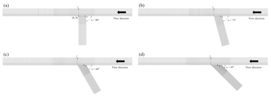 Numerical simulations were conducted to analyze changes in solute mixing with flow and mixing changes stemming from junction angle modifications. The channel used for numerical simulation was designed based on the laboratory experimental channel considered by Shumate [51], and the length scale was increased to 10 times the original size. Through simulations using the scaled-up channel, flow and mixing patterns in small-scale streams, which are often found in urban areas covered with concrete (n = 0.013) with a small width-to-depth ratio, were reproduced. According to the Froude similitude, the channel length, width, and discharge values used in our experiments are listed in Table 2. The confluence channel used for simulation was set to have the same width of W = 9.14   m for the main and tributary channels in all cases. The downstream boundary water depth ( h 0 ) for the numerical simulations was 2.96 m, which conforms to the geometric ratio. The junction angle was changed in 15° intervals with five cases, from 30° to 90°. Based on the results of grid sensitivity analysis, the grid size was set to be W / d x > 20 , and the number of vertical layers was set to 10 for the flow and mixing simulations by applying quasi-three-dimensional characteristics. The computational grids are presented in Figure 3.