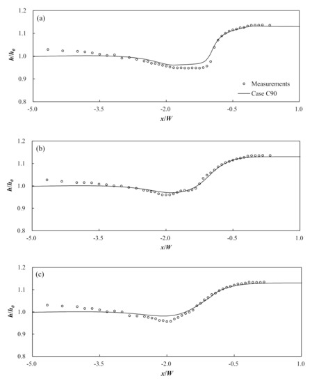 Figure 4. Comparisons of water depth for Case C90: (a) y/W = 0.17; (b) y/W = 0.50; (c) y/W = 0.82.