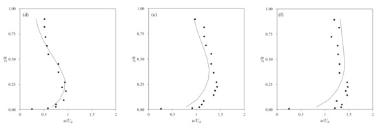 Figure 5. Comparisons of vertical profiles of velocity for Case C90: (a) x/W = −1.0, y/W = 0.17; (b) x/W = −1.0, y/W = 0.50; (c) x/W = −1.0, y/W = 0.82; (d) x/W = −2.5, y/W = 0.17; (e) x/W = −2.5, y/W = 0.50; (f) x/W = −2.5, y/W = 0.82. Ud is the downstream cross-sectional averaged velocity.