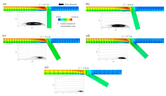 In this study, the reproducibility of the flow structures associated with the junction angle of the designed confluence was evaluated based on numerical simulation results. Figure 6 presents the depth-averaged velocity and streamlines in the recirculation zone developed by the tributary inflow. The inflow of the tributary causes flow separation and the maximum velocity is generated by flow contraction at the right bank. The stagnation zone appears in the upstream junction corner and the velocity at this point decreases. The size of the recirculation zone increases as the junction angle increases, which has been reported in previous studies [12,23,38,53].