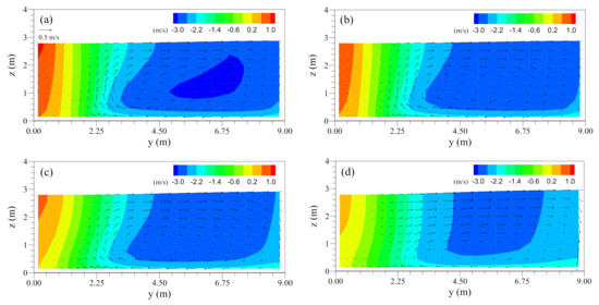 Figure 7. Comparisons of u-velocity magnitude and vw velocity vectors at the center of the recirculation zone: (a) C90 (x* = 6.7 m); (b) C75 (x* = 6.6 m); (c) C60 (x* = 5.1 m); (d) C45 (x* = 2.7 m). Negative velocity indicates a flow direction heading downstream.