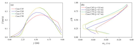 Figure 7 compares the u and vw velocity vectors at the cross-section in the middle of the recirculation zone depicted in Figure 6. The negative sign of the velocity contour in Figure 7 indicates flow heading in the downstream direction. The channel-scale helical cell is developed under the simulation conditions of M r > 1 [54]. As the junction angle increases, the center of the clockwise helical cell is positioned near the bottom of the channel. Figure 8 presents more detailed features of the transversal velocity associated with the clockwise helical motion shown in Figure 7. The depth-averaged vertical deviation of the v velocity is given as I = 0 h v 2 d z / h , where v is the vertical deviation from the depth-averaged velocity ( v ¯ ) and indicates the strength of the circular motion (Figure 8a). The maximum value of I occurs in the C90 case and decreases as the junction angle decreases. At each of the maximum values of I , the vertical distributions of vorticity in the x-direction (ωx) are plotted according to the junction angle (Figure 8b). The results also reveal that helical motion develops strongly as the junction angle increases. Additionally, the strength of the helical motion increases near the left bank (0 < y < 2 m), where the recirculation zone is developed as the junction angle decreases. This indicates that the transverse transport of the solute in the recirculation zone may be weakened as the junction angle increases.