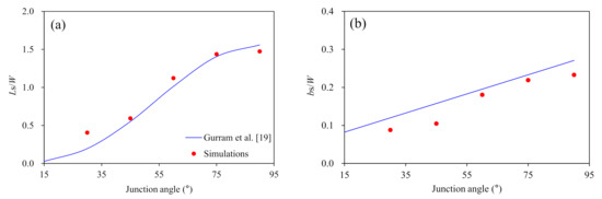 Figure 9. Recirculation zone size versus junction angle: (a) Recirculation zone length; (b) Recirculation zone width.