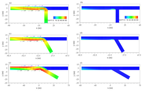In Figure 11, the concentration distributions and streamlines of the vw velocity, in the same cross-section shown in Figure 7, are depicted for t = 2.4 min. All cases reveal results in which the concentration at the bottom of the channel is relatively higher than that at the upper water surface. These results were obtained because the u velocity is lower at the bottom of the channel, resulting in less solute dispersion compared to the water surface, as shown in Figure 7. Additionally, the clockwise helical motion, which creates a strongly distorted mixing interface, causes rapid mixing with high discharge from the tributary. The distortion of the mixing interface results in an increase in the effects of u w on turbulent diffusion [18]. As the junction angle increases, the vertical gradient of the mixing layer also increases as a result of the strongly developed helical cell. The solute cloud transported near the water surface by helical motion spreads to the outer bank. In contrast, near the channel bottom, the solute cloud moves to the inner bank where the recirculation zone is located. Then, the cloud is stored to accumulate the solute.
