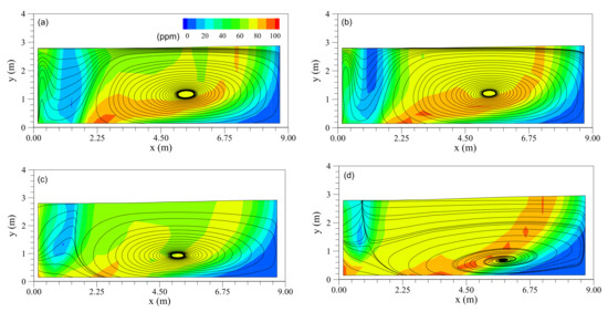 Figure 11. Concentration contours with streamlines in the recirculation zone at t = 2.4 min: (a) C90 (x* = 6.7 m); (b) C75 (x* = 6.6 m); (c) C60 (x* = 5.1 m); (d) C45 (x* = 2.7 m).