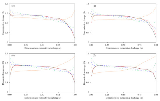 Figure 12. Dimensionless cumulative discharge versus dimensionless dosage at: (a) x = 0; (b) x = −W; (c) x = −2W; (d) x = −3W; (e) x = −4W; (f) x = −5W.