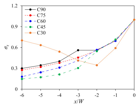 The mixing metrics defined in Equation (4) can be utilized to evaluate transverse mixing. Figure 13 presents the changes in the dimensionless mixing metric ( σ r ), which was normalized using the standard deviation of the dosage curve at x = 0 ( σ u s ), as shown in Figure 12a. Upstream of x = 2 W , the value of σ r was not affected by the junction angle, except for the C30 case. The C30 case shows that the deviation of the transverse dosage is minimized as a result of active transverse mixing, causing σ r to decrease quickly. However, as a result of wall reflection, σ r increases downstream of x = 2 W , where transverse mixing is completed. These results indicate that as the junction angle decreases, transverse mixing becomes more active, causing a decrease in the transverse concentration deviation. In cases where the junction angle is below 45°, the tributary flow with high momentum causes the solute cloud to be transported to the far bank. Then, the solute is positioned near the outer bank as a result of wall reflection, resulting in an increase in the transverse concentration deviation.