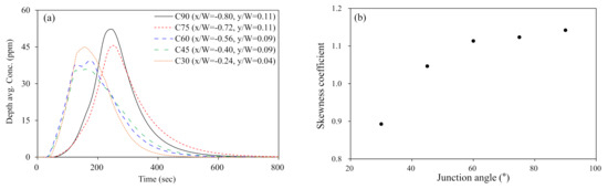 Figure 14. Properties of concentration–time curves in the recirculation zone according to the junction angle: (a) Concentration–time curves; (b) Skewness coefficient of the concentration–time curves.