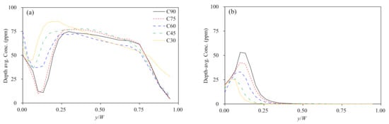Figure 15. Lateral distribution of the depth-averaged concentration in the center of the recirculation zone for different simulated cases: (a) t = 2.4 min; (b) t = 4.1 min.