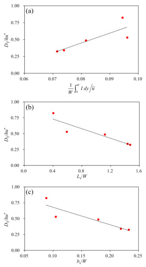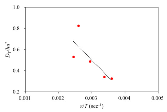 In natural streams containing storage zones, 1D longitudinal mixing is achieved by shear flow dispersion and mixing in the storage zone, as shown in Equation (10). Regarding the relationship between shear flow dispersion and storage zone effects, Choi et al. [56] demonstrated a negative correlation between the mass exchange rate ( ε / T ) and longitudinal dispersion coefficient in the flow zone ( K f ). This inverse relationship can be said to reduce the shear flow dispersion, as mixing by the storage zone is strengthened. Additionally, this study revealed that the existence of a recirculation zone affects transverse mixing. Therefore, to discuss the storage effects on transverse mixing due to a recirculation zone, the relationship between ε / T and D T / h u * is plotted in Figure 17. Similar to the relationship between ε / T and K f , D T / h u * also has a negative correlation with ε / T . As in Fischer et al. [40], the longitudinal shear dispersion has an inverse relationship with the transverse dispersion coefficient; in the present study, the decrease in D T / h u * leads to an increase in longitudinal shear dispersion. Therefore, ε / T and D T / h u * simultaneously reduce the longitudinal shear dispersion, and transverse mixing is replaced by mixing in the storage zone when the recirculation zone is strongly developed.