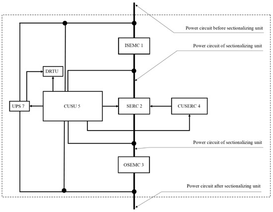According to Figure 2, the diagram of SU contains input switching element of manual control (ISEMC 1), switching element of remote control (SERC 2), output switching element of manual control (OSEMC 3), control unit of switching element of remote control (CUSERC 4), control unit of sectionalizing unit (CUSU 5), data receiving and transmitting unit (DRTU 6), and uninterruptible power supply unit (UPS 7).