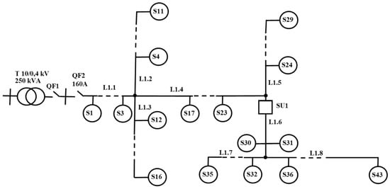 According to Figure 4, T is power transformer, QF1 is input automatic switch for 0.4 kV busbars, QF2 is automatic switch of outgoing PTL, L1.1–L1.8 are 0.4 kV PTL sections, and S1–S43 are consumers. Among them, consumer S23 is an experimental greenhouse, and consumer S29 is a pumping station, interruptions in the power supply of which must be as minimized as possible. At the same time, consumers S30–S43 are residential buildings having low power consumption and not requiring increased PS reliability. In addition, the data on accident rate for PTL sections were assessed. They revealed that the PTL section supplying consumers S30–S43 is the most urgent; that is, damage occurs on it much more often than on other sections. Therefore, the location of SU installation was tentatively determined on the branch line (section L1.6, Figure 4) at a distance of 0.25 km from TS (closer than 0.29 km). According to the technical reports of the power grid company servicing the Mezenka network, the annual electricity consumption by the entire PTL powering the village is 227,800 kWh per year, whereas the annual consumption for SU installation location at a distance of 0.25 km from TS is 63,070 kWh per year. The estimated time of scheduled outages during a year is 7.16 h, while emergency power supply outage time amounts to 3.59 h, with the proportion of unstable failures accounting for well over half of all cases (60%). The damage caused by electricity undersupply for the entire transmission line is RUB 56,820 per year, that is, USD 757.6 at the exchange rate of USD 1.00 per RUB 75.00.