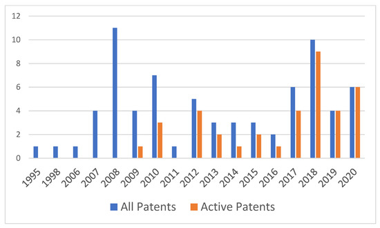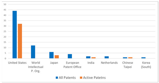 Regarding the publication source that contributes the most to the number of publications in prospective patent documents, the distribution of active patents worldwide is highly concentrated (Figure 3). The results showed that only four countries are responsible for the most significant interest and domain in the technology investigated in this study: The United States of America, Japan, India, and Chinese Taipei. Additionally, the United States has a significantly higher number of patents active than the other countries. In the segment of patents not active, we can also identify publication sources in the WIPO and European Patent Office, organizations representing multiple countries, as long as the Netherlands and South Korea.