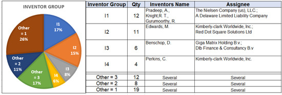 Concerning active patents, six different inventors’ groups correspond to 54% of the patents, with the United States owning five groups. The remaining 49% of the documents are applicable by different inventor’s groups with a single application by a group.