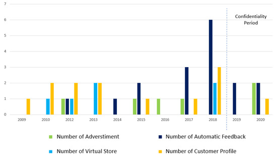 The patents could be grouped by application, and the authors divided them into four different categories: Virtual store, Customer profile, Advertisement, and Automatic Feedback. Virtual stores are patents related to the application of Virtual Reality in stores. Customer profiles are patents using Virtual Reality to identify the consumer profile, their intents of purchasing, etc. Advertisements are patents that use VR to advertise products/processes to the public, and Automatic Feedback are patents related to the automatic interpretation of the user of VR through their changes in body positions, pupil changes, facial reactions, brainwaves, etc. In terms of classification by application, from 2009 to 2020, we identified patents related to virtual store applications in five patents from the United States and one from Chinese Taipei. Chinese Taipei, India, and Japan have one classification in customer profile, while the United States has ten documents. Concerning advertisement, only Japan and the United States are represented in the Confidentiality Period with this classification with two and four applications, respectively.