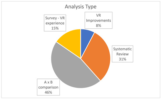 In the articles selected for our study, we discovered various forms of analysis. We grouped them as follows: (a) VR improvements refer to research conducted in an application or environment where Virtual Reality is already being used, with the goal of improving its performance, such as switching the Virtual Reality application from non-immersive to immersive; (b) comprises investigations based on a survey of the literature and incorporates knowledge from various articles, studies, and fields; (c) A × B comparison, where the authors develop a correlation of several immersive virtual environments or an immersive environment compared to a physical one. The immersive virtual environment is a perception of physically being there in a non-physical setting; the final sort of classification is based on (d) surveys of Virtual Reality users. Their knowledge and experiences are gathered through the use of specific questionnaires. For example, surveys are conducted with automakers experts on present VR applications and their anticipated future in several business domains. Figure 6 illustrates the analysis type distribution.