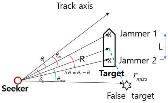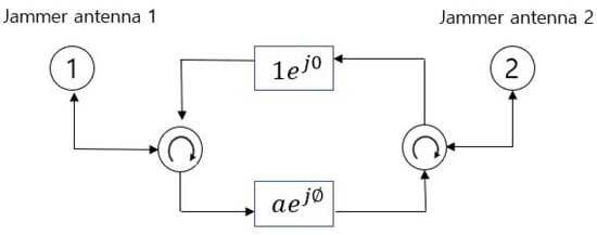 In this section, cross-eye gain is defined, and MSD is defined as Equations (1)–(5). Cross-eye jamming can deceive the monopulse’s angle tracking. Cross-eye jamming is implemented by placing two jamming antennas on board ship. The jamming antennas radiate the jamming signal.