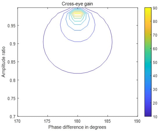 3) that the jamming effect of cross-eye changes significantly due to the amplitude ratio and phase difference. That is, the cross-eye gain is the function of amplitude ratio and phase difference. Due to mechanical defects, the amplitude ratio and phase difference can change differently from the nominal values; thus, changing the gain of the cross-eye. Degraded cross-eye gain is denoted by