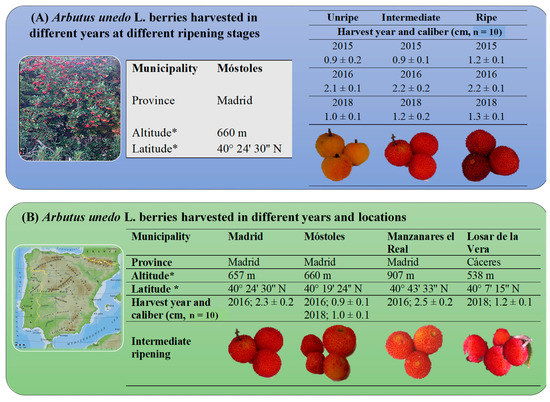 (a) A. unedo L. fruits harvested in different years at different ripening stages and (b) A. unedo L. fruits at an intermediate ripening stage collected from different Spanish locations.