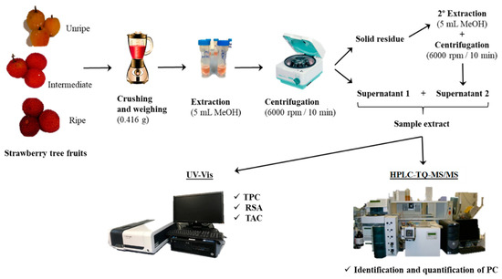 After the optimization of the sample preparation, the final extraction protocol was as follows: 20 g of berries were defrosted and crushed in a grinder to obtain a homogeneous paste. Then, around 0.4 g were weighed by duplicate in falcon tubes where the extraction process took place. For this purpose, 5 mL of the extraction solvent (MeOH) was added (sample/solvent ratio 1:12, w/v), and the mixture was stirred for 1 min in a vortex (Rx3, Velp Scientifica, Usmate, Italy). Then, the samples were centrifuged (Rotofix 32, Hettich zentrifugen, Tuttlingen, Germany) at 6000 rpm for 10 min. Afterwards, a second extraction of the resulting pellets was completed using the same volume of MeOH, and the supernatants of both extraction cycles were combined and filtered through 0.45 μm nylon membrane filters and, finally, kept at −20 °C until analysis. The strawberry tree berry extracts were analyzed in duplicated using spectrophotometric techniques (UV-Vis) to determine the TPC, the RSA, and the TAC. Likewise, the sample extracts were also analyzed in triplicate by HPLC-TQ-MS/MS to quantify the PC. Figure 2 shows a scheme of the procedure followed for sample preparation and analysis.