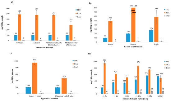Evaluation of (a) solvent, (b) cycles of extraction, (c) type and time of agitation, and (d) sample/solvent ratio to optimize the strawberry tree berry extraction conditions. The TPC is expressed as mg GAE/100 g FW, the RSA is expressed as mg TE/100 g FW, and the TAC is expressed as mg cyn-3-glu/100 g FW.