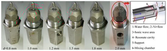 - Gao, J.M.; Ma, J.L. Design and test of low-frequency Hartmann atomization nozzle with stepped resonance tube. Trans. Chin. Soc. Agric. Eng. 2017, 33, 66–73. [Google Scholar]