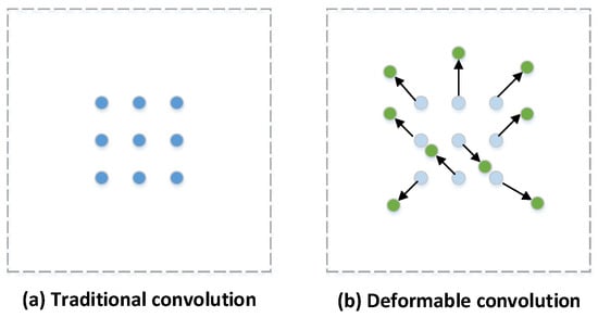 Since deformable convolution breaks the shape of the conventional sampling area, the sampling points may be expanded to the part outside the area of interest during the use of the model, and more irrelevant information and context information may be included, which would affect the performance of the model. Therefore, deformable convolution v2 [] proposes an improved scheme. The parallel network not only learns the offset value of each position but also learns the weight of each sampling point to avoid the influence of extreme sampling points on network feature extraction. Through weight control, the influence of having too much context information can be effectively reduced, a greater degree of freedom can be added, and the weights of sampling points that may not be needed can be learned to bring them to zero. The calculation formula then becomes: