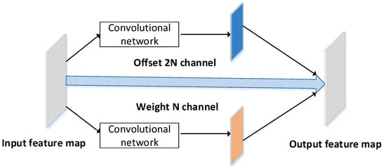Through the parallel convolutional neural network, the sampling point offset value () and weight value () can be incorporated into the network learning process. Assuming that the input feature map of the parallel network has N channels, and the sampling point offset part corresponds to the offset value of the two dimensions, then the number of output channels corresponds to 2 N. Meanwhile, the weight network is the weight value of each sampling point, and the number of channels corresponds to the number of input channels, N. The block diagram of its realization is shown in Figure 3.