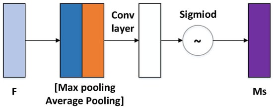 The realization of the spatial attention module is shown in Figure 4. First, average pooling and maxpooling are used to compress the input feature map F, and mean and max operations are performed on the input features in the channel dimension. Then, the two obtained feature maps are spliced according to the channel dimensions, and a convolution operation is used to reduce the dimension to one channel. It is ensured that the obtained feature map is consistent with the input feature map in the spatial dimension; finally, the spatial attention feature Ms is generated through the sigmoid function.
