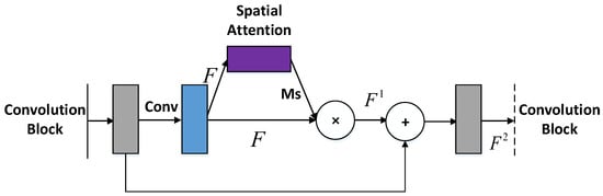 The method of adding spatial attention to the structural blocks of the ResNet-50 network is shown in Figure 5. The feature map generated in the previous layer is subjected to a convolution calculation to generate the input feature map F. After F passes through the spatial attention module, the spatial attention feature Ms is obtained. The elementwise multiplication of F and Ms is performed to obtain a new feature map, . Then, and F are added together, the residual module of ResNet is retained, and the generated feature map, , is used as the input of the next module.