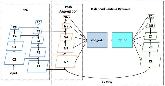 In response to these issues, this paper proposes a new feature fusion method of path aggregation-balanced FPN (PAB-FPN) based on an FPN, as shown in Figure 6. First, the feature maps C2–C5 generated by ResNet-50 are merged through a top-down feature pyramid to obtain feature maps P2–P5, and P6 is obtained by two downsamplings from P5 to enhance robustness. Then, bottom-up pyramid fusion is added behind the FPN, and the strong positioning feature at the bottom layer is transferred to obtain the feature map N2–N6. Then, the five-level features are uniformly scaled to the N4 size, and the integration operation is performed. The specific operation formula is as follows: