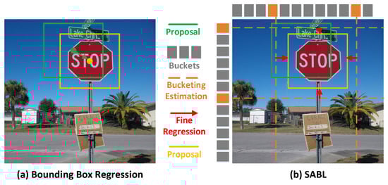 The mainstream frame generation method is shown in Figure 7a, which obtains the frame information by predicting the center point and the center offset; however, due to the large variance of the regression object, this does not improve the positioning accuracy very much. This paper draws on the idea of side-aware boundary localization (SABL) [], as shown in Figure 7b, and locates the border of the bbox by using the border information of the feature map content to obtain higher-quality bbox border information.