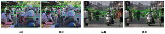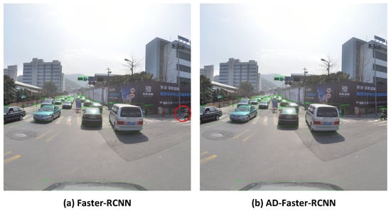 To see the detection effect more intuitively, Figure 8 shows the visualization of the results of detecting vehicles and pedestrians in common scenes such as roads and streets with the use of the Faster-RCNN and AD-Faster-RCNN algorithms. Figure 8(a1)–(a4) show the detection result of the Faster-RCNN algorithm. In the figure, it can be seen that there is a certain degree of leak detection for small objects and occluded objects (marked with a red circle). Figure 8(b1)–(b4) show the AD-Faster-RCNN algorithm detection results. Compared with the Faster-RCNN algorithm, AD-Faster-RCNN has better detection performance on small-scale pedestrians and vehicles, the score is generally higher, and it has higher detection efficiency.