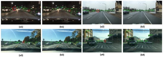 Figure 9(a1)–(a4),(b1)–(b4) are the detection results of Faster-RCNN and AD-Faster-RCNN on the BDD100k data set, respectively. It can be seen from the figure that AD-Faster-RCNN solves the problem of missed detection of small objects to a certain extent. This includes detection in various driving scenarios such as night, rain, street, and road. This shows that the model proposed in this paper has a certain generalization ability and versatility, and can effectively adapt to object detection in autonomous driving scenarios.